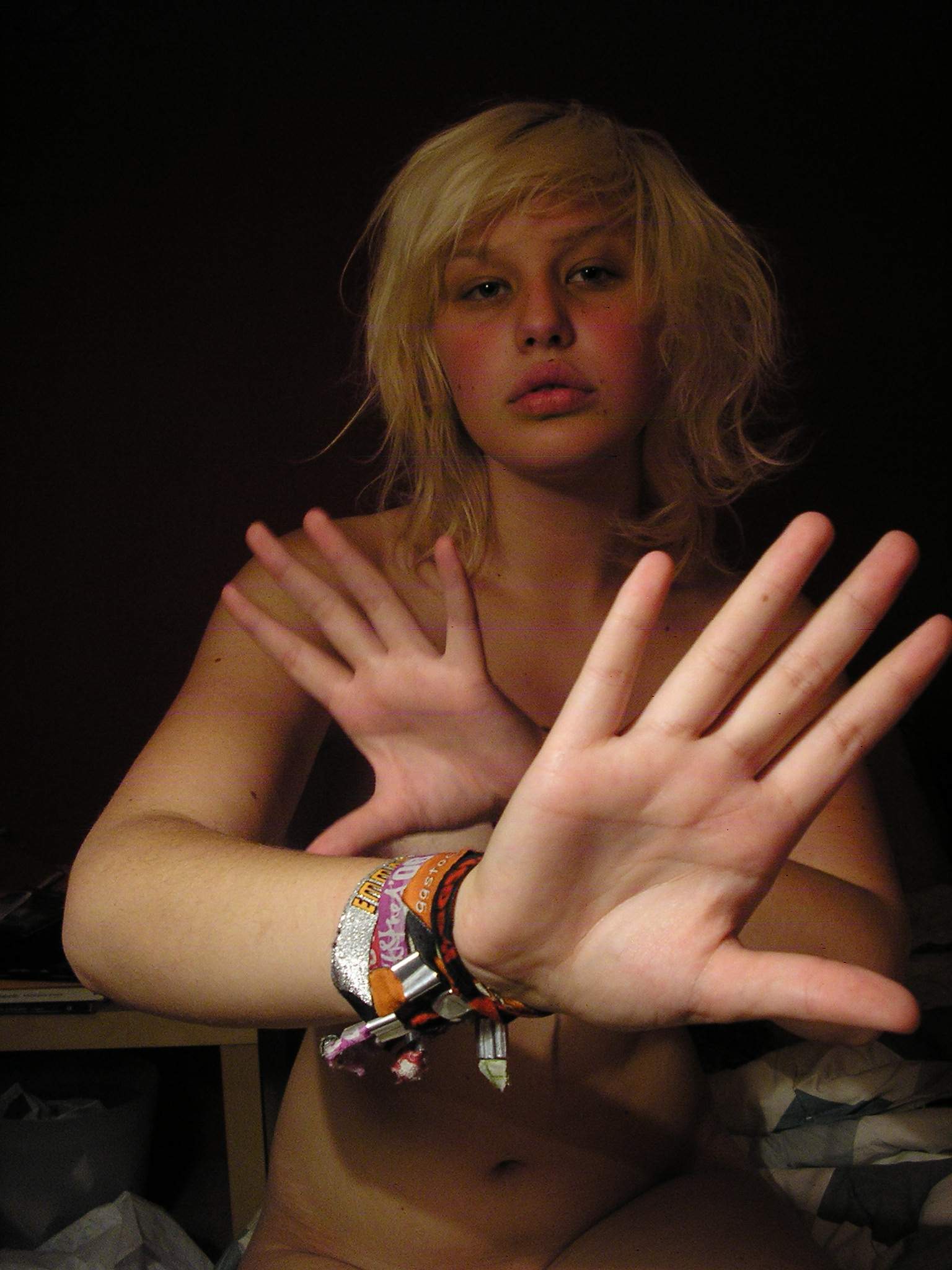 Model Chick willacat atomicfrog lips blonde topless tits boobs eyes handbra cover punk goth rock