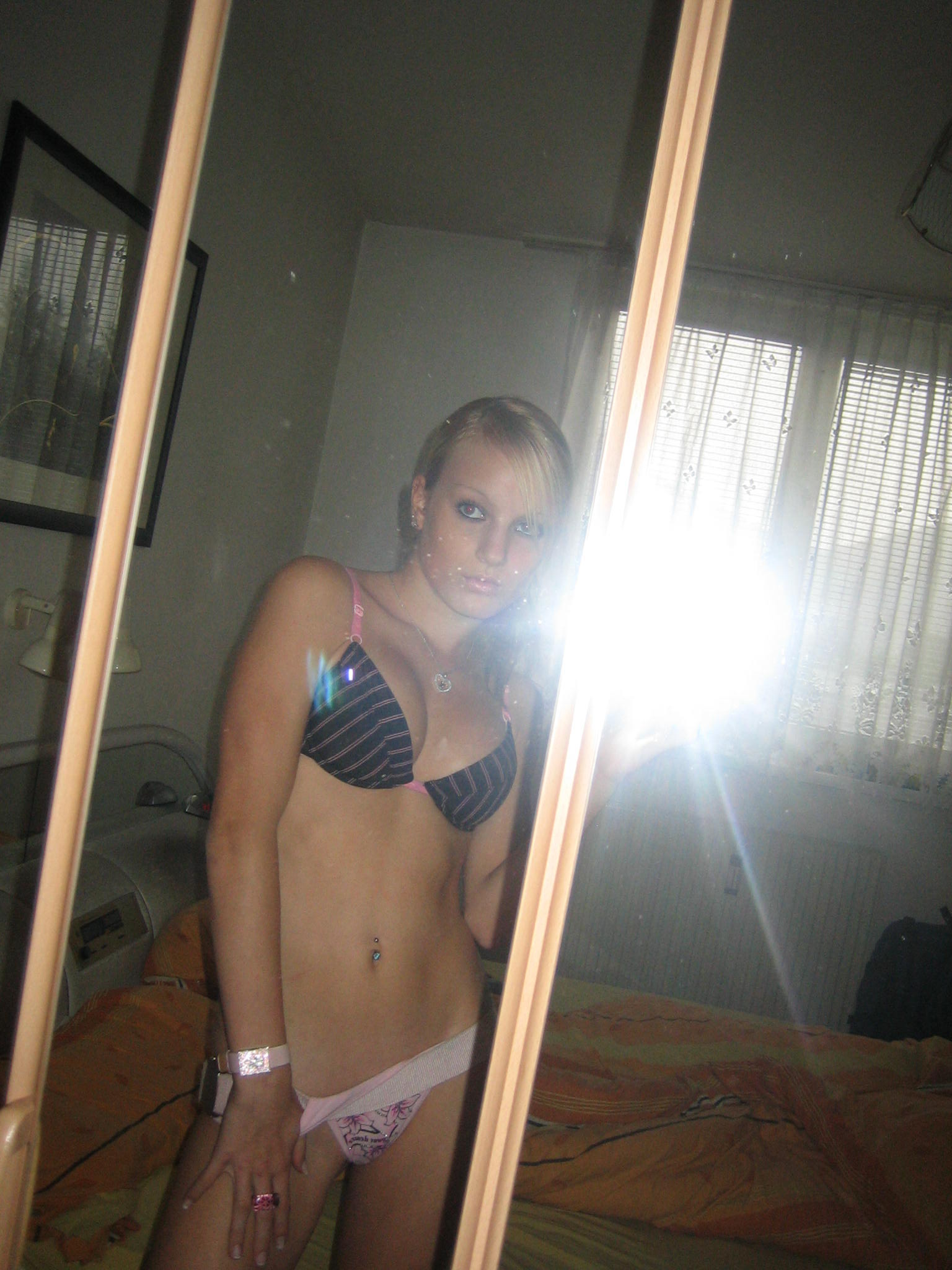 No Smile Dromeus atomicfrog mirror blonde blondie selfshot self topless bra panties boobs tits breasts wet wet-tshirt wettshirt jeans pose handbra butt booty skinny thin