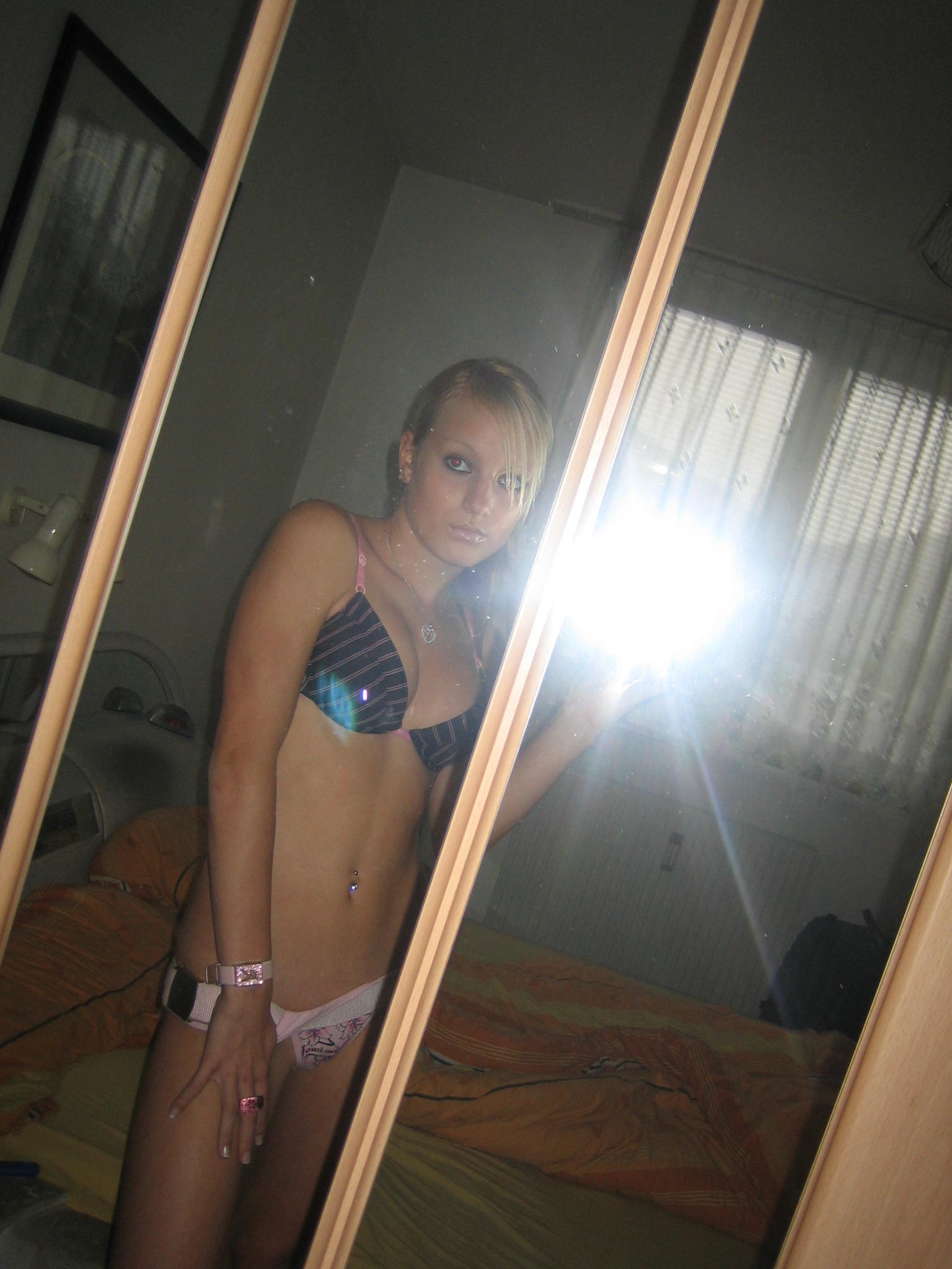 No Smile Dromeus atomicfrog mirror blonde blondie selfshot self topless bra panties boobs tits breasts wet wet-tshirt wettshirt jeans pose handbra butt booty skinny thin